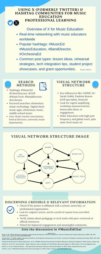 I created an infographic to showcase how music educators can use X to strengthen their professional learning networks. It outlines search methods like targeted hashtags, curated lists of music education leaders, and advanced search filters to find the most relevant posts. The visual network map highlights key influencers such as NAfME and prominent music education advocates who shape online conversations. An important section focuses on evaluating credibility, verifying professional affiliations, ensuring original content, and cross-referencing shared resources with reputable publications or organizations.