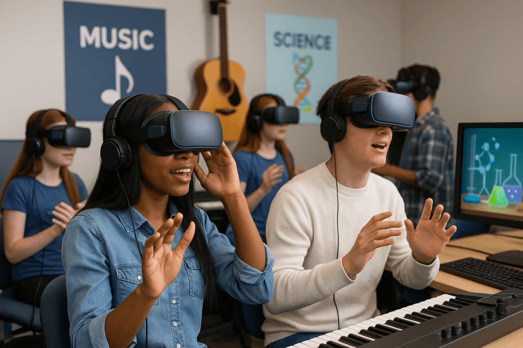For example, VR field trips can allow students to experience professional recording studios worldwide, while AR overlays can teach music theory interactively by visualizing chord structures in real time. Immersive virtual labs also give students the ability to explore complex audio engineering processes without risk or costly equipment (Radianti et al., 2020). Research highlights that VR/AR increases engagement and knowledge retention by making abstract concepts tangible and accessible (Johnson-Glenberg, 2018). For music education in particular, these tools help bridge gaps for students with different learning preferences or disabilities, ensuring that all learners can thrive in creative expression (Southgate et al., 2019).
